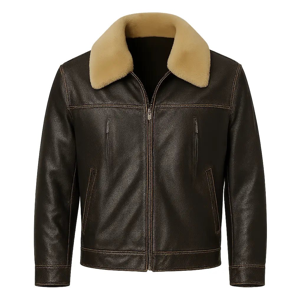 The jacket’s made with leather, giving it a smooth look that lasts. Inside, there’s a snug polyester layer keeps things comfy without bunching up. Built to feel warm but not heavy, thanks to its zip up front and thick shearling trim around the neck. It comes in a dark brown shade, works with almost any outfit. Long sleeves run all the way down, adding balance and polish perfect when you want to dress sharp without trying too hard.