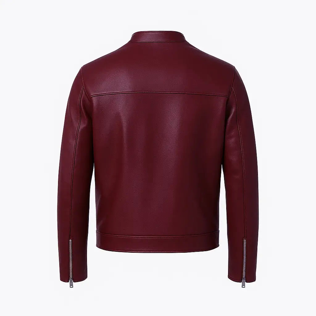 The jacket made from a mix of faux and leather gives it a bold, layered look. On the inside, a smooth polyester layer brings warmth without adding thickness. Shaped like a classic biker jacket, it’s got a zip up front connected to a short stand up collar that snaps shut. The color A rich dark red stands out quietly compared to common shades around. Sleeves run full length and finish with zippered ends, giving edge but still holding onto that old-school cool look.
